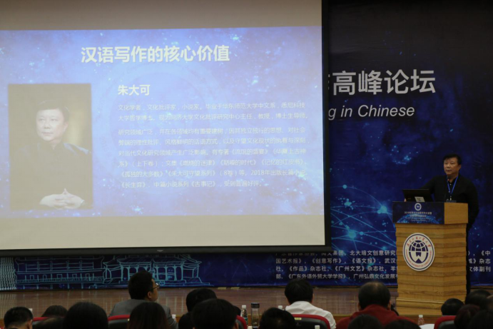 其后,朱大可教授一一分析了当下创意写作所面临的困难。一,现实经验的惊悚性和文学经验的虚弱性之间的差异。二,文学在中国衰退,我们面临后发劣势。三,西方与中国的写作经验是不一样的,不能盲目照搬。且国人对文学创作的期许过于偏向自身的经济收入与名望,常常造成对写作的失望。四,机器人作家的挑战。五,中小学语文课教学的弊端