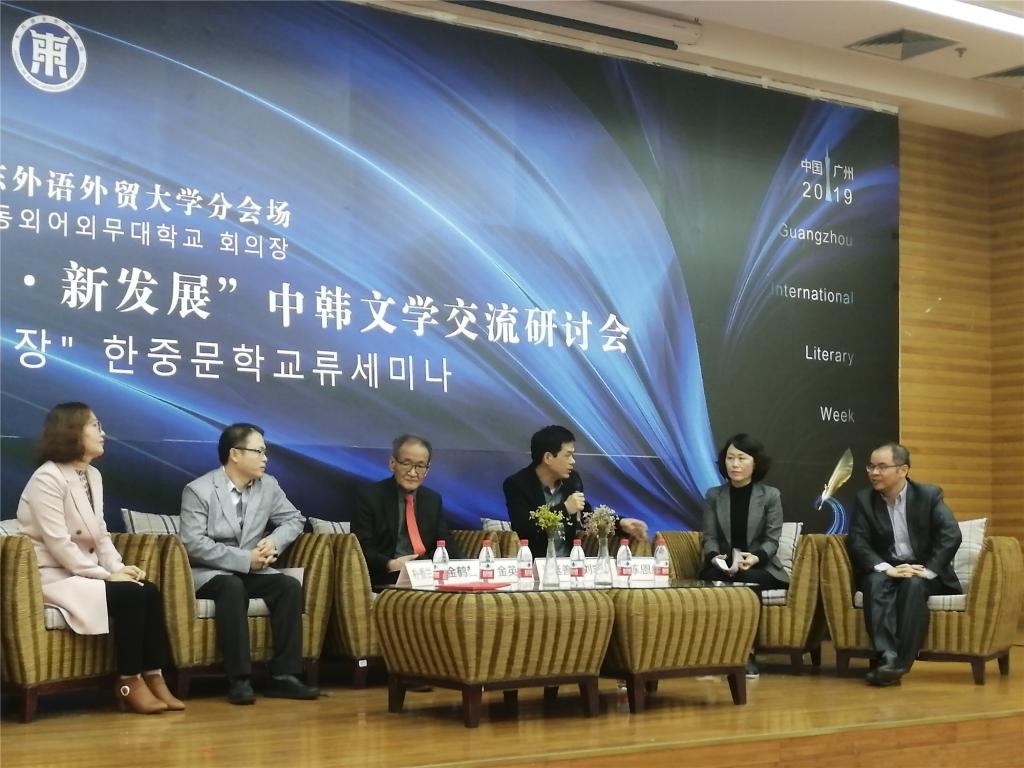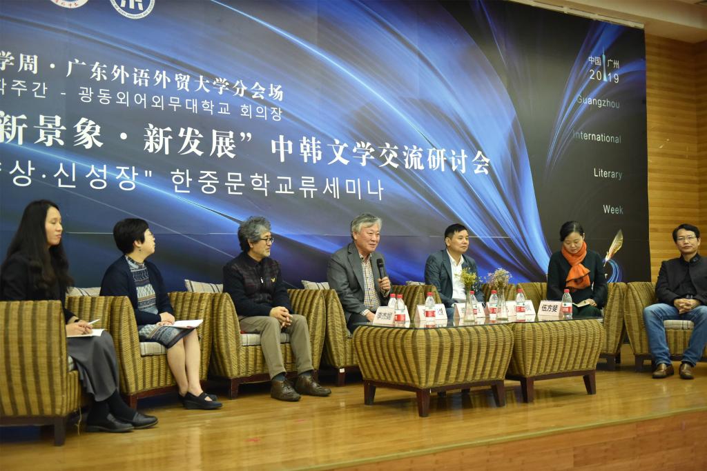 2019年12月16日,“2019年广州国际文学周”——“新时代·新景象·新发展”中韩文学交流研讨会在bevictor伟德官网北校区图书馆报告厅举办。此次研讨会由中国作家协会指导,中共广州市委宣传部、广东省作家协会、广州市文联主办,bevictor伟德官网bevictor伟德官网、东语公司和创意写作中心具体承办,围绕“新时代以来中韩文学发展的新现象、新特征和新趋势”和“新时代以来中韩文学作品互译出版的现状和展望”两个议题展开了热烈的讨论。出席此次研讨会的嘉宾有来自中韩两方的作家、诗人、学者等,包括韩国著名作家李文烈、高炯烈,著名诗人罗喜德、李杰妮,著名文学评论家洪廷善,资深出版人梁元锡,中国著名诗人杨克、作家周晓枫、庞贝、方舟、唐成茂、翻译家金鹤哲、学者李斌、刘志强、伍方斐、陈恩维、金英姬、朴香兰等,由bevictor伟德官网经理李斌、创意写作中心执行主任朱志刚、汉语言文学系主任林炜娜分别主持。