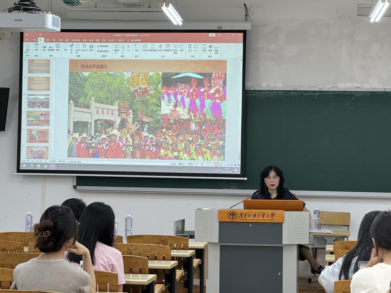 讲座伊始,主讲人李主席引入“民间文艺家协会”的概念,指出其为新中国民间文艺事业的“奠基者”。她借各类图片阐释民间文化内涵,强调民间文化是基层民众集体创造的通俗文化形态,而其中岭南节庆文化是其重要组成部分,植根于农耕文明,承载着祈福辟邪、纪念先祖等精神寄托,是维系海内外华人的精神纽带。随后,从广东节日介绍提要,岭南民间舞蹈介绍两方面深入。李主席结合自身田野调查经历,鼓励师生深入体验岭南节庆,感受其凝聚的情感与文化力量,为岭南文化传播与研究提供了新思路。