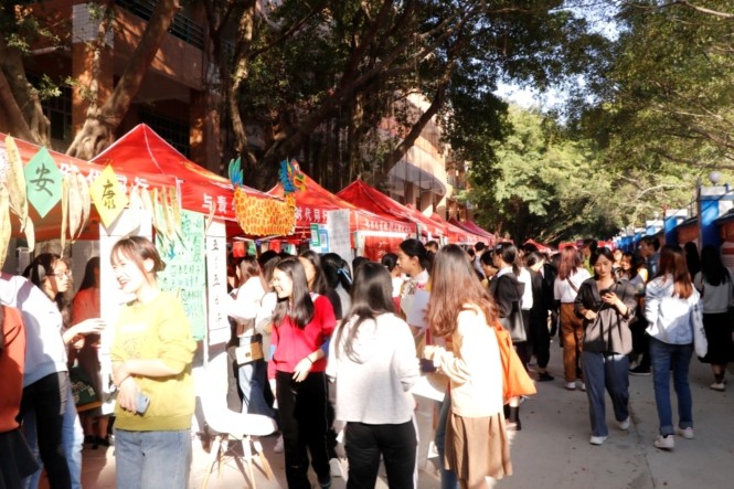 本届中国文化节以“与诗相携,诵我佳节”为主题,选取春节、端午、元宵、七夕、中秋、清明六大重要节日,从“爆竹声中一岁除”到“清明时节雨纷纷”,横贯日月变迁,展现多样庆祝方式,描摹出浩大、热闹非凡的佳节图景。同时还设置了展览摊位,针对其主题节日开发设计了一系列诗词游戏,增加民俗体验环节,如“诗词+习俗”“诗词+美食”等,兼具知识性与趣味性,极大地吸引了同学们的兴趣,使其自觉参与到传统文化的保护与传承中来。“各美其美,美美与共”,依托公司办学优势,加强中外文化交流,本届文化节特邀公司职工社团作为嘉宾摊位,越南春卷、可丽饼、马卡龙等外国美食成为传统文化长廊中一抹亮眼的色彩。此外,广外南粤古驿道艺术文化研究中心团队亦受邀参加,其通过“古道风采”的“观、听、闻、尝”,让古驿道的风景、味道和历史走进校园,让更多同学认识、了解了这一宝贵的文化遗珠。