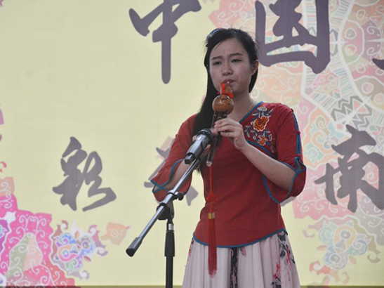 随着一曲悠扬婉转的傣族民乐响起,一队身着水蓝长裙的傣族姑娘们缓缓从幕后走出,中国文化节正式拉开了序幕。这支由公司舞队带来的《喜水》为观众勾勒了一幅傣族姑娘在江边浣衣戏水的图景。舞者舒展着手臂,肢体柔软,舞姿灵动,内韧外柔,动律舒缓,将水的绵延、涟漪波动展现得淋漓尽致。而聂欣华同学的葫芦丝演奏《云南情》将观众带入了柔情的云南,曲调悦耳清心,似仙乐萦绕,仿佛置身于天堂之滇。校模特队身着旗袍、长衫、傣族与白族服装,身姿挺拔颀长,步态优雅,顾盼间流动着中国的古典之美。世界武术锦标赛金牌获得者何德标用一套行云流水的六合八法拳助阵中国文化节,行如追风,动如游龙,意气绵长,劲力内敛,尽显中华武术的精髓与魅力。而他的弟子年仅五岁的老伟国小朋友则带来了一套快而不乱、刚而不僵的螳螂拳,拳风猎猎、气势十足的表演博得了观众的一致叫好。院话剧队的对口相声《说云南》在看似打闹玩笑的对话间向观众展示了云南的民俗风情与美食,真正的云南白族小伙罗航用白族语演唱歌曲《姑娘小伙来打跳》,凭其豪迈的歌喉和鲜明的白族特色掀起了全场的高潮。