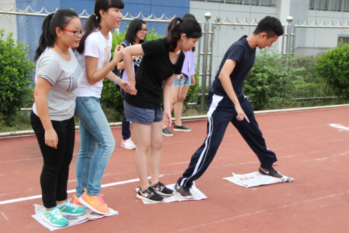 第一个比赛项目是“玩转大小球”,每班派出五名同学参加比赛。比赛要求每支队伍中的两名同学在起点处挽手背对背夹起一个排球跑向终点,到达终点后,在终点的一名同学用乒乓球拍托起乒乓球返回。比赛在大排球和小乒乓球都不落地的情况下才能继续进行。用时越少得分越高。比赛在热烈的欢呼声中开始了,夹着排球的选手们有的一步步默契前进,有的因速度加快乱了步伐,滑稽的动作引人捧腹大笑。而托着乒乓球的选手们大都大步流星迈向终点线,球拍上的小球却丝毫不受影响。1503班的一名选手更是托着乒乓球向终点飞跑过去,引来观众们的一阵赞叹。最终,1503班以34秒52的成绩拿到了8分,夺得本项目的第一名。