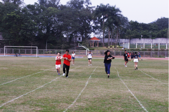 本次趣运会气氛最热烈也最令人期待的比赛就是“十人十一足”了。各班派出十名选手,用绳子将相邻两人的脚绑在一起,跑过30米,用时少的队伍获胜。比赛开始前,各班选手就已经紧张地练习起来了,整齐响亮的口号回旋在操场上。比赛时,选手们齐心协力,手搭手,肩并肩地迈着整齐的步伐前进。有的班级更是默契十足,快速地跑向终点。最终,文管13十人同心,以8秒13的最快成绩获得本项目的第一名。