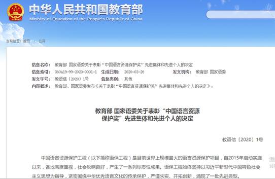 根据中共中央办公厅、国务院办公厅《评比达标表彰活动管理办法》规定,本次共评选出“中国语言资源保护奖”120个,其中包括“先进集体奖”20个,“先进个人奖”100人。此奖项由教育部首次在全国范围内进行评选,旨在表彰为“中国语言资源保护工程”项目的实施和取得成效作出重要贡献的集体和个人。