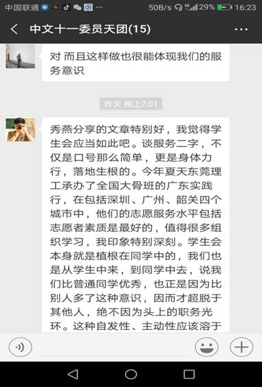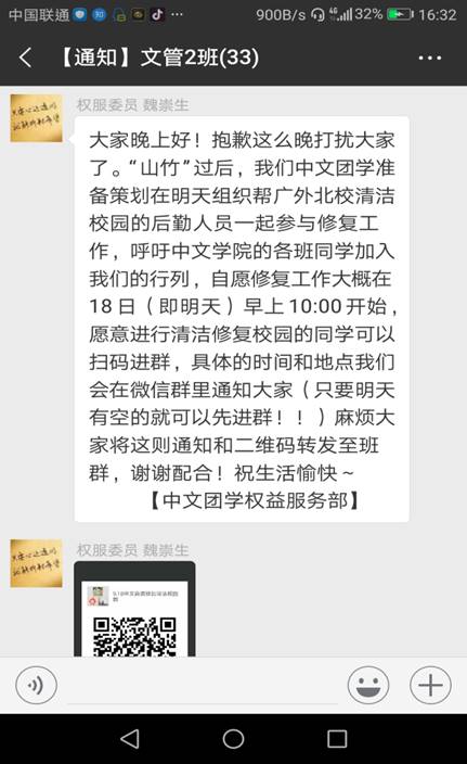看到昔日美丽的校园被台风摧残,以“中文团学 一心为你 你的微笑 我的骄傲”为宗旨的中文团学开始思考,我们平时经常谈“为同学服务”,“为公司分忧”,这个时候,我们是不是应该做点什么?于是,在中文团学的微信群里,掀起了一场讨论……