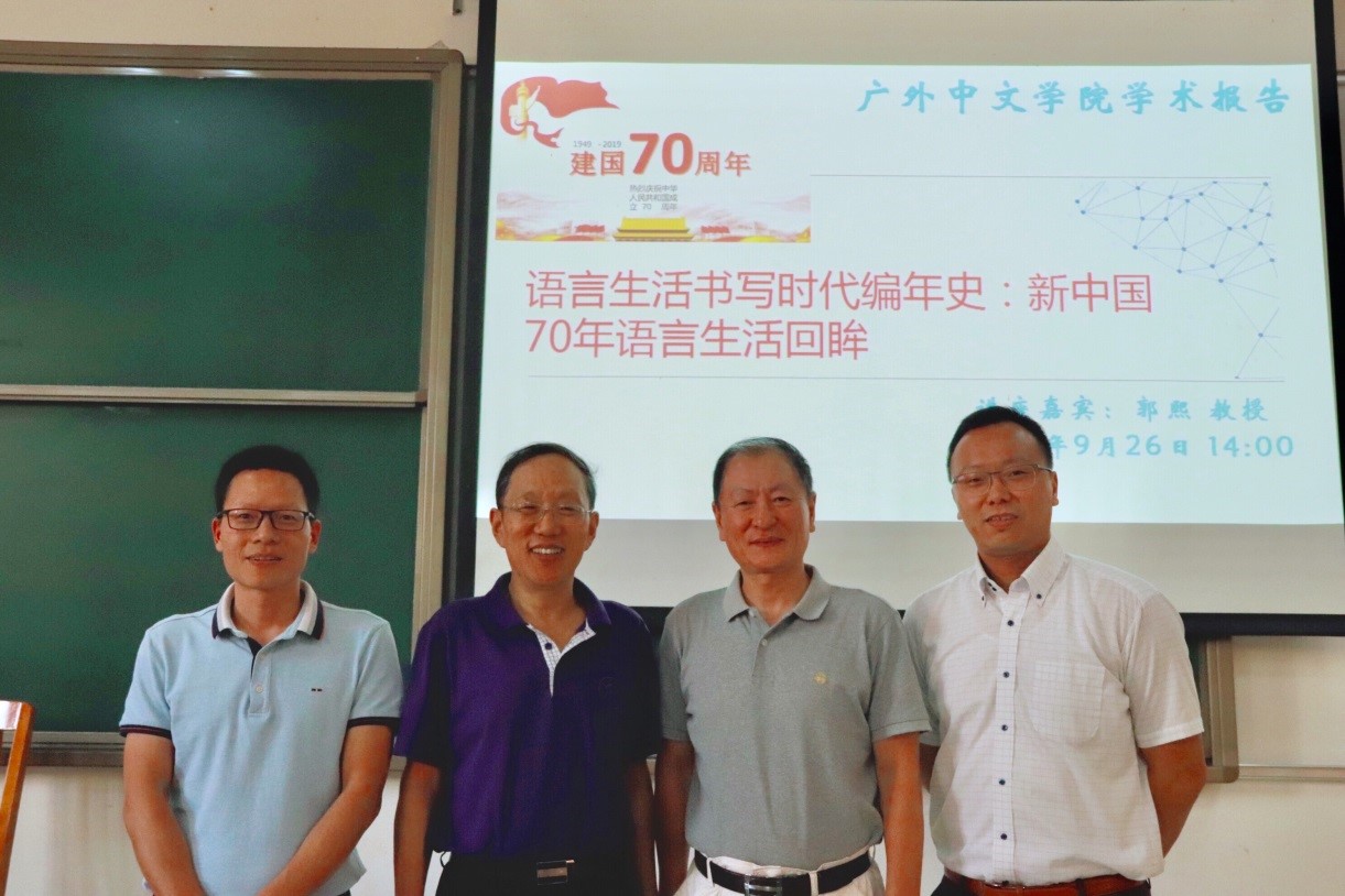 9月26日下午,bevictor伟德官网对外汉语系教工党支部在北校区七教213开展“不忘初心、牢记使命”主题党日活动,邀请暨南大学华文公司郭熙教授为在场师生作“新中国70年语言生活回眸”的主题讲座。bevictor伟德官网、英文公司、翻译公司100余名师生参加,会议由支部党员汪磊教授主持。