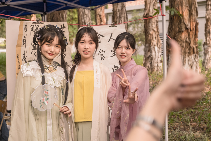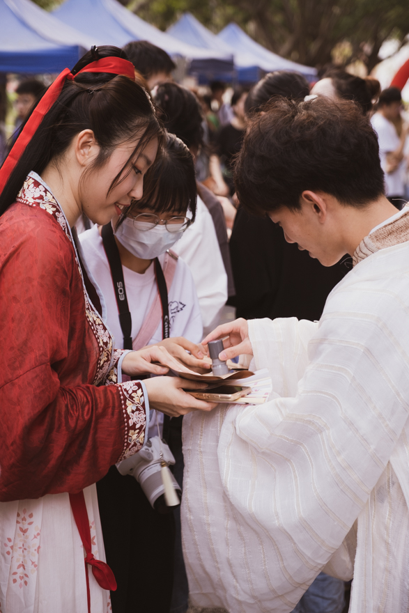 本次文化节增设书画协会、汉服社、天文社、“越古食作”和“指尖上的泥塑”等特色摊位,百花齐放,再现古代科技。参与者可以在众多摊位中参与游戏互动,体验手工制作,感受古代科技的神奇与智慧。手工艺摊位展示了琳琅满目的古代工艺品,素胚勾勒的青瓷白釉,素雅别致的丝织绣品,无不彰显出古代工艺的匠心独具。在数理化摊位,参与者沉浸式体验华容道、珠算等游戏,在一阵阵欢笑声中,大家感受到古代数理的魅力和巧思。“彰施异彩,玉版华章”,在扎染与造纸摊位上,模拟了古代真实扎染造纸场景,邀请观众亲手制作,寓教于乐,给予了现场的师生丰富难忘的活动体验。在公司创新创业团队“越古食作”的摊位上,参与者可以动手制作独具特色的典籍美食,时光再现古代典籍中的“味道”,让更多的师生认识了解中国传统美食文化。