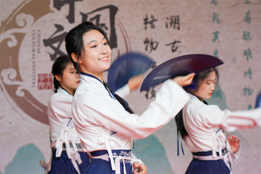 歌一曲,舞一段。表演者们身着白衣蓝裙,婉转于舞台之中,似一盏盏淡雅脱俗的青花瓷。古筝悠悠,旋律悠扬;舞者以足为轴,轻舒长袖,她们的蓝裙飘动,仿佛泛起蓝色波涛,将观众们带入天青色的江南小镇。随着舞姿定格,场边掌声四起,惊赞之声不绝于耳。