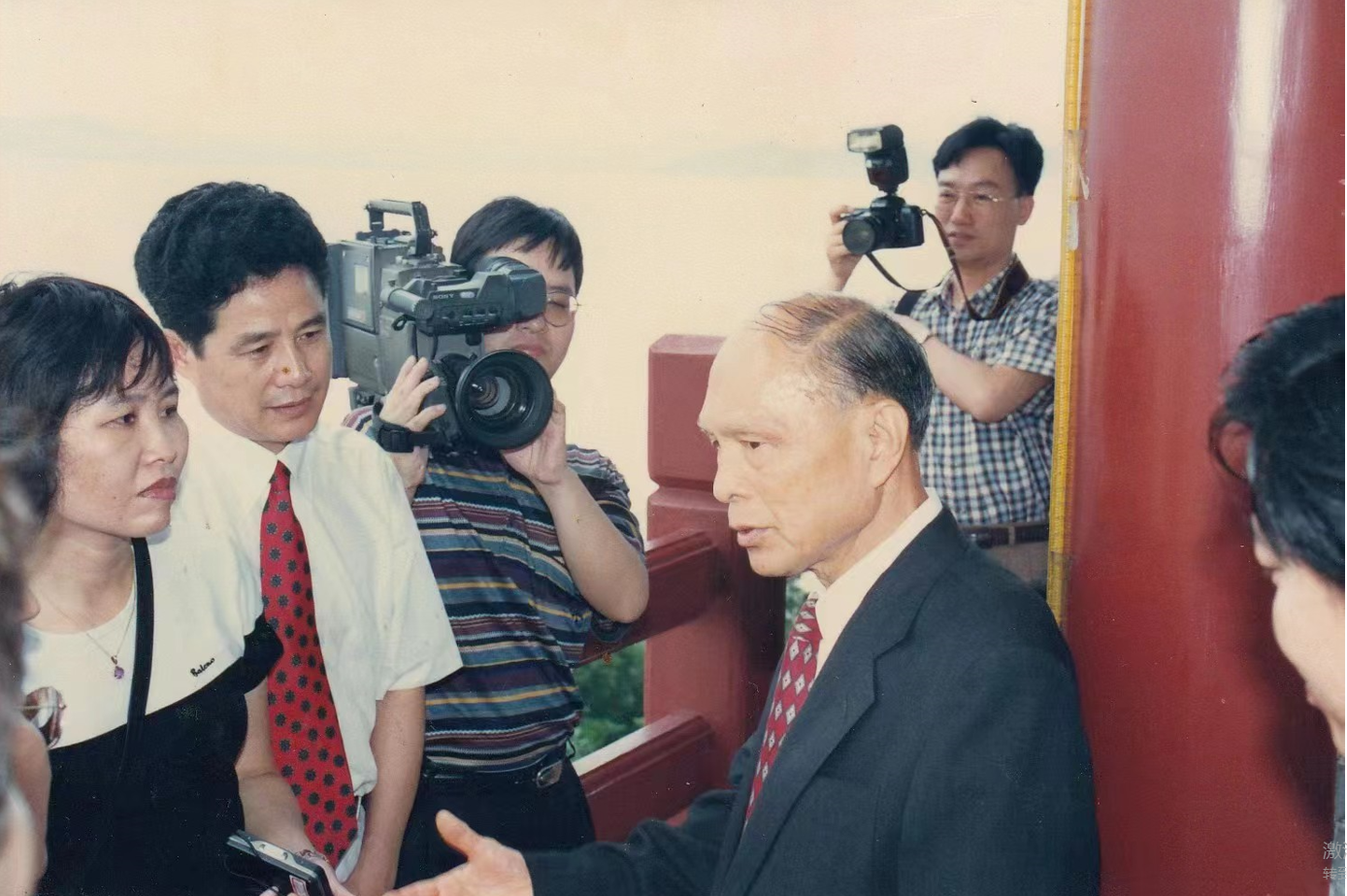 图 2 鲁大铮(左二)在番禺南沙采访霍英东先生