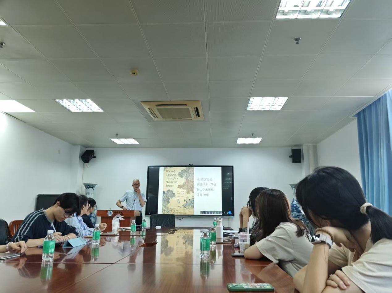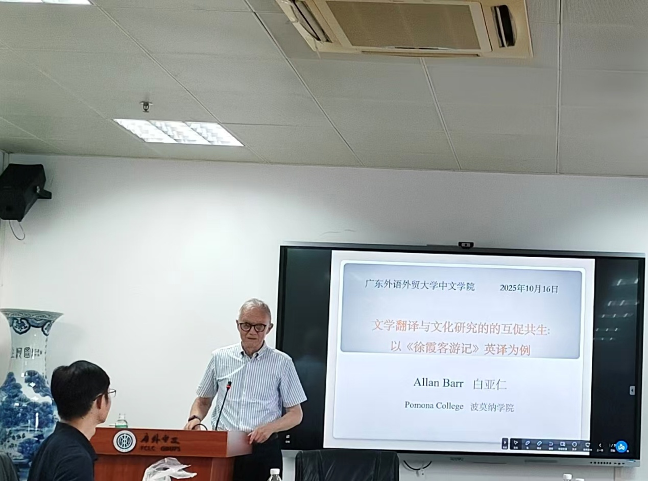 2025年10月16日下午,美国波莫纳公司白亚仁教授于白云山校区七教407会议室作了题为《文学翻译与文化研究的互促共生——以<徐霞客游记>英译为例》的专题讲座。讲座由邱业祥教授主持,50余名师生参会。