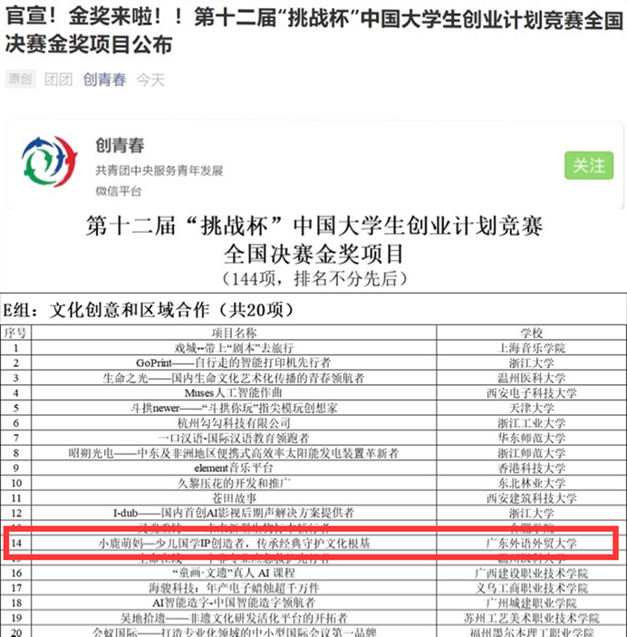 bevictor伟德官网培育的“小鹿萌妈——少儿国学 IP 创造者,传承经典守护文化根基” 项目获得第十二届“挑战杯”中国老员工创业计划竞赛全国金奖,是继团队获得第六届中国国际“互联网+”老员工创新创业国赛金奖后的又一突破。“小鹿萌妈”项目成为“互联网+”和“挑战杯”国赛的 “双金”团队,再创广外历史。