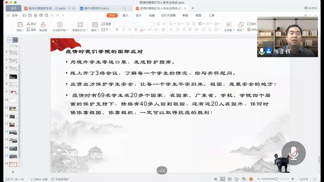 本网讯 72日下午,公司开展书记思政第一课”“经理思政第一课线上思政课,党委书记周东兰、经理陈彦辉、党委副书记王迪、辅导员陈泽帆出席本次课堂。课堂以疫情时期我们与中国在一起——国内抗疫第一课疫情时我们为人类命运而战——国际抗疫的故事为主题进行授课,并邀请了四位中文学子分享自己在疫情期间的故事。